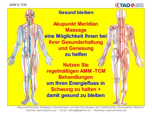 Ziel der AMM ist es, dass dein Qi (Energie) im Meridian- und Organsystem ungehindert fließen kann. Ist dies der Fall, ist der Mensch laut Ansicht der TCM gesund, wenn nicht, ist das der Beginn von Krankheit. Krankheit beginnt bereits auf der energetischen (immaterieller) Ebene des Körpers, oft lange bevor sie sich auf körperlicher (materieller) Ebene manifestiert.